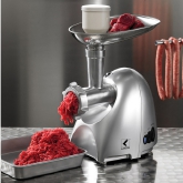 Handy and solid household meat mincer, the excellent price-performance ratio in the silver plastic case. The device with enterprise-system (size 8) is designed for semi-professional use.