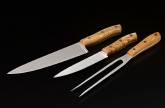 Perfect for your Dry Aged Beef: Handmade quality knives and carving fork. Set of 2 knives + fork with riveted olive wood handles – wow!